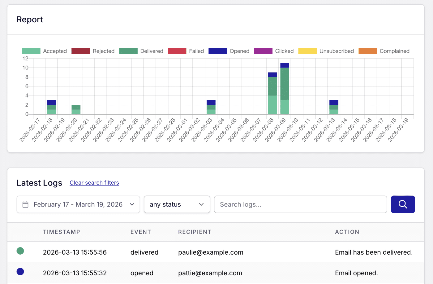 You’ll see a record of every email sent, including delivery status, recipient address, timestamp, subject line, and any error messages.